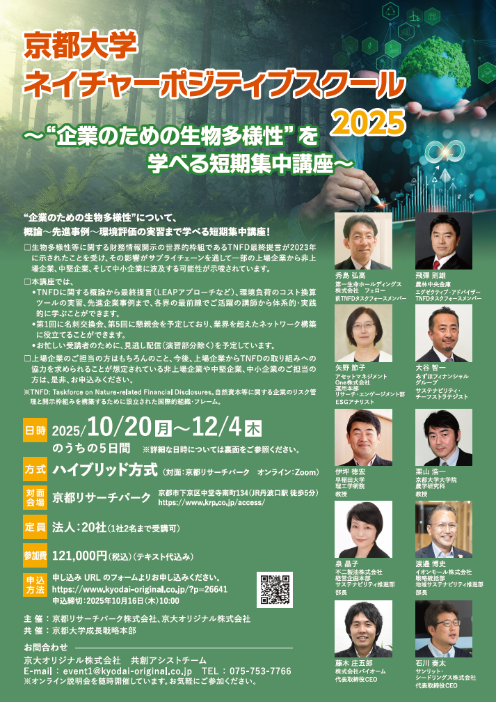 京都大学ネイチャーポジティブスクール2025~”企業のための生物多様性”を学べる短期集中講座~(2025年10月20日~2025年12月4日)
