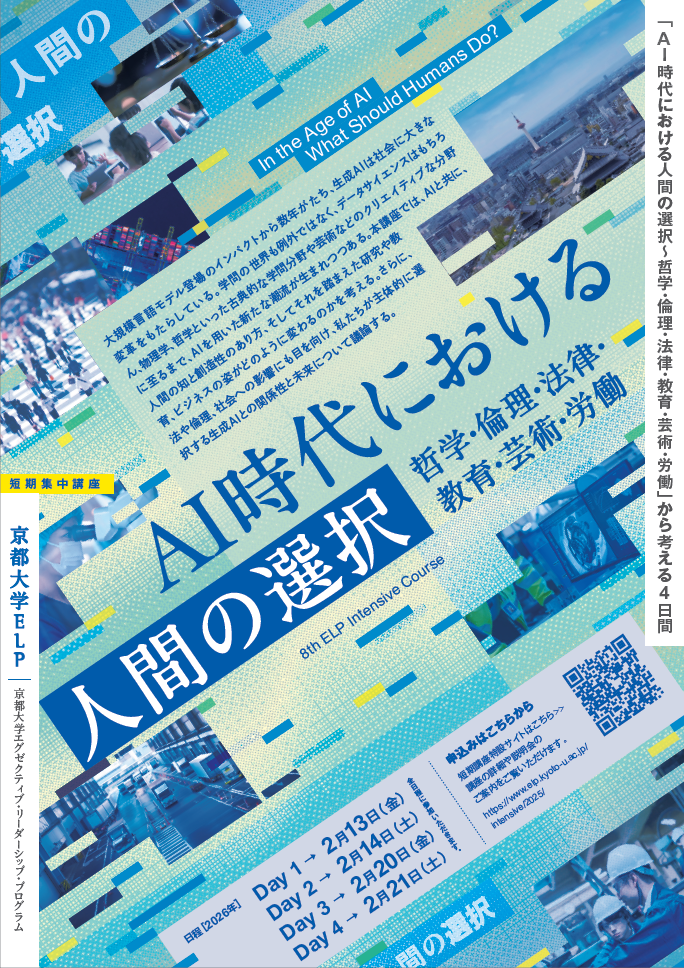 京都大学ELP短期集中講座「AI時代における人間の選択 〜哲学・倫理・法律・教育・芸術・労働から考える4日間」開催(2026月2月13日~21日)