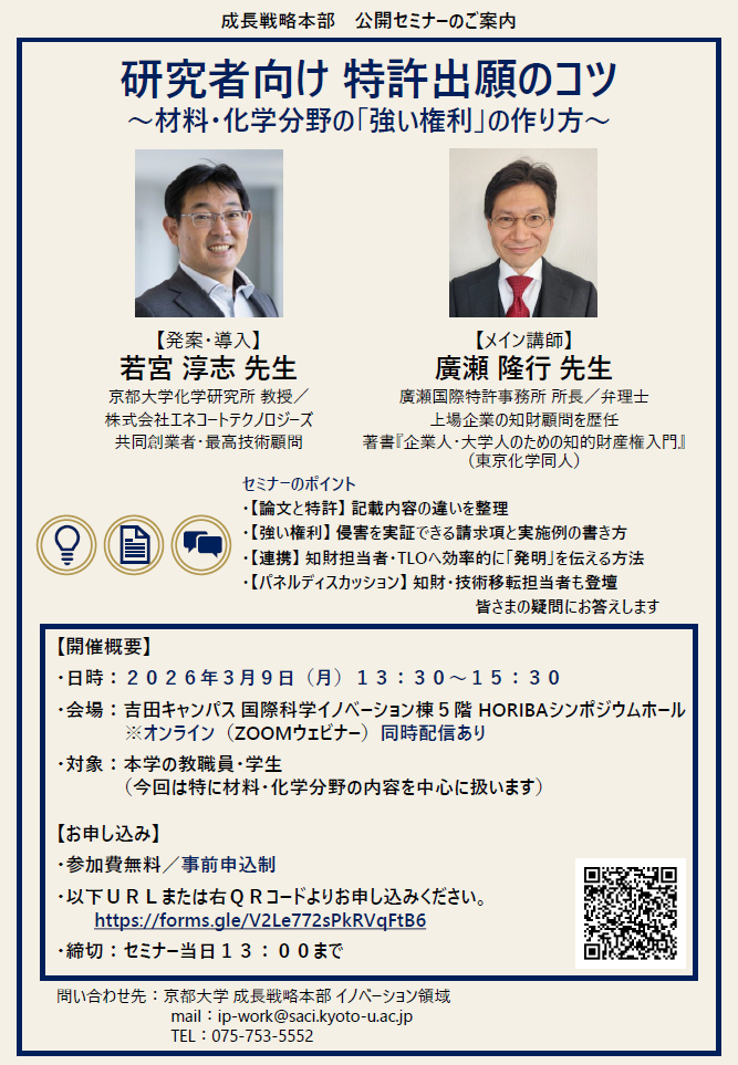 化学研究所の若宮淳志教授の発案により、特許実務の第一人者である廣瀬隆行弁理士を講師にお招きした、研究者のための実践的セミナーを開催します。
