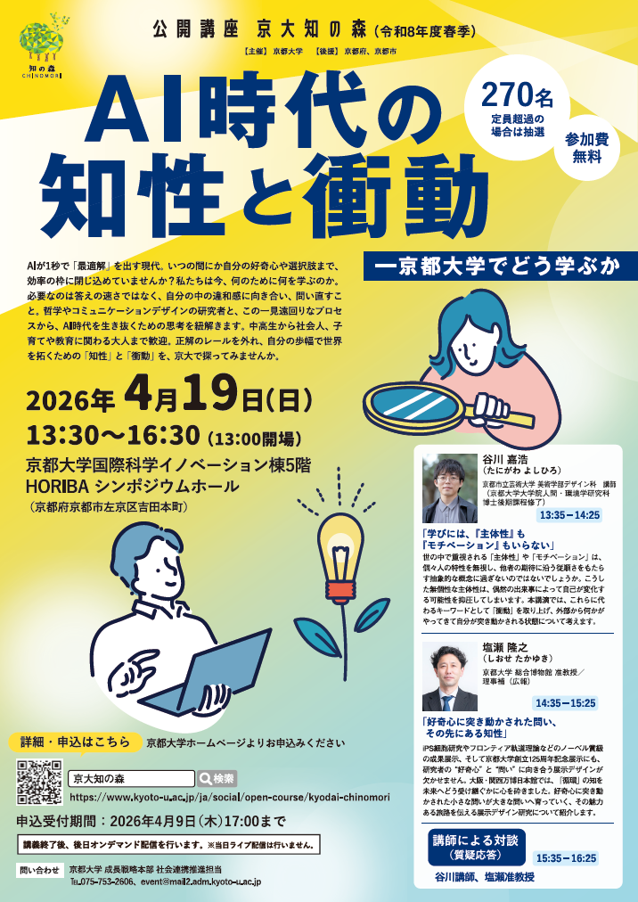 公開講座京大知の森(R8春季):「AI時代の『知性』と『衝動』 -京都大学でどう学ぶか」(2026年4月19日)