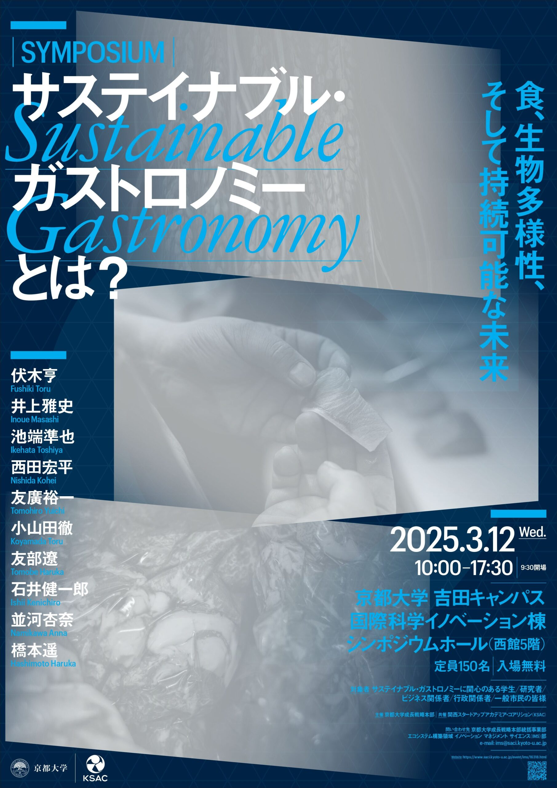 本シンポジウムは、食・住・環境の持続可能性を多角的に考察し、サイエンス・伝統知・テクノロジー・ビジネスの融合による新たな循環型社会の構築を目指します。サステイナブル・ガストロノミーの本質を探求し、自然環境・生物多様性の保全、文化的景観の維持、人間の健康に焦点を当てた持続可能なビジネスの創出と持続可能な未来について考えます。