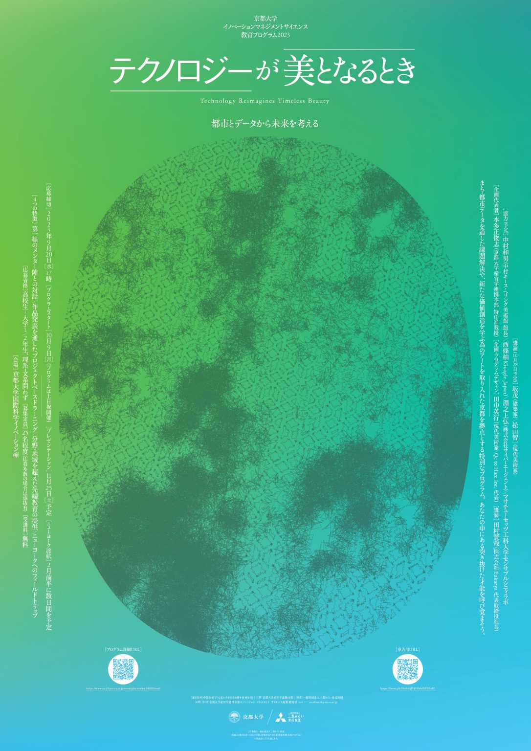 ※情報メディア、都市工学等に高い関心のある方を歓迎します。デジタルアート、プログラミング (JavaScript等)のスキルを持っていたり、意欲的かつ卓越した能力を秘めた若者。ノーコードで作成することも可能ですので、前提条件はありません。京都大学以外の学生も歓迎します。