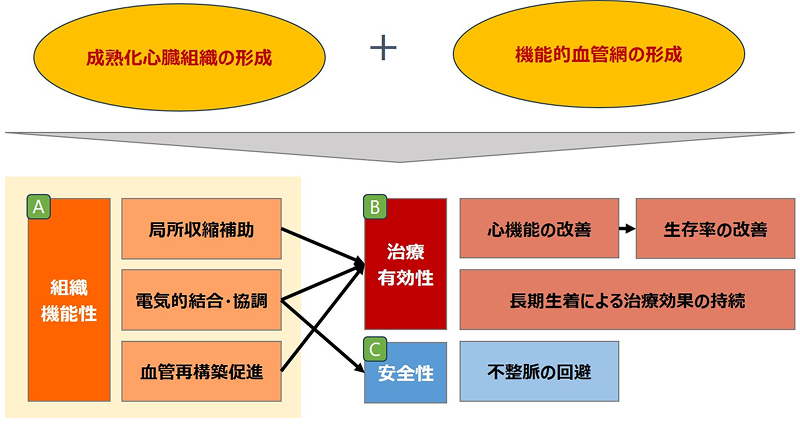本プロジェクトでは、オルガノイドを用いて成熟化した「プラグイン心臓組織(PiCT)」による心臓機能拡張に基づく次世代再生医療の実用化をめざしている。 対象疾患は、いまだアンメットメディカルニーズの高い心不全を想定している。PiCTは、オルガノイドと独自の成熟化技術により作製された機能的血管網を有する成熟化心臓組織であり、次世代のオルガノイド医療として高い有効性・安全性を長期的に発揮することが期待されている。